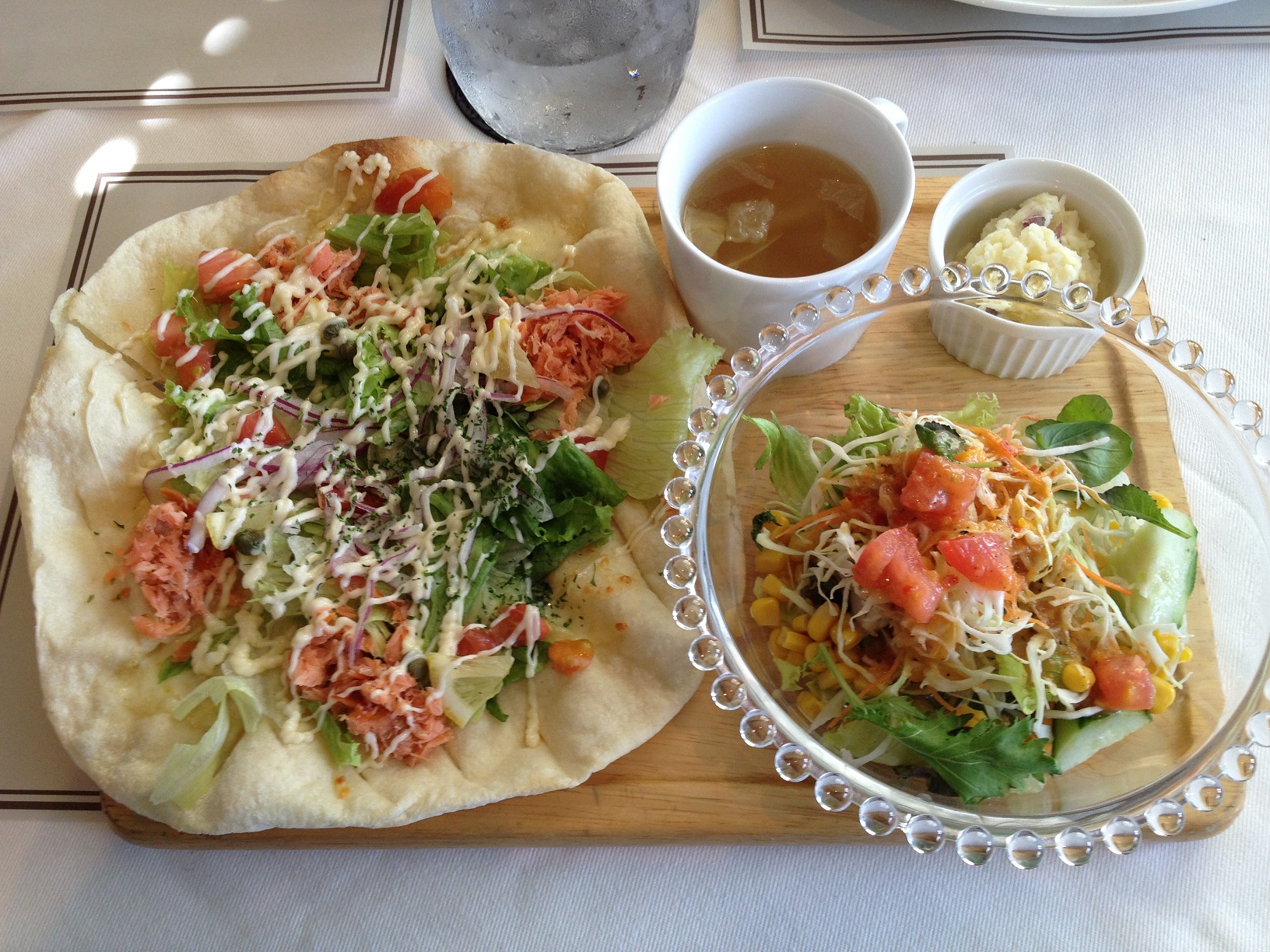 サラダピザ・・・生地はとても薄く上にはたっぷり野菜とサーモンがのっています。さらにサラダまで付いてきます!