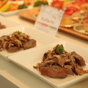 - ステーキに③のきのこソースをかけて、上からコーヒー用クリームをかける。