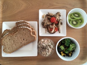 ライ麦パン、サバ缶のリエット風、きのこのオーブン焼き、