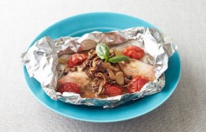 4. フライパンに(3)と水を1/2カップ入れて加熱し、沸騰したら蓋をして弱火で10分ほど蒸し焼きにする。仕上げにホイルを開いて、バジルをちらす。