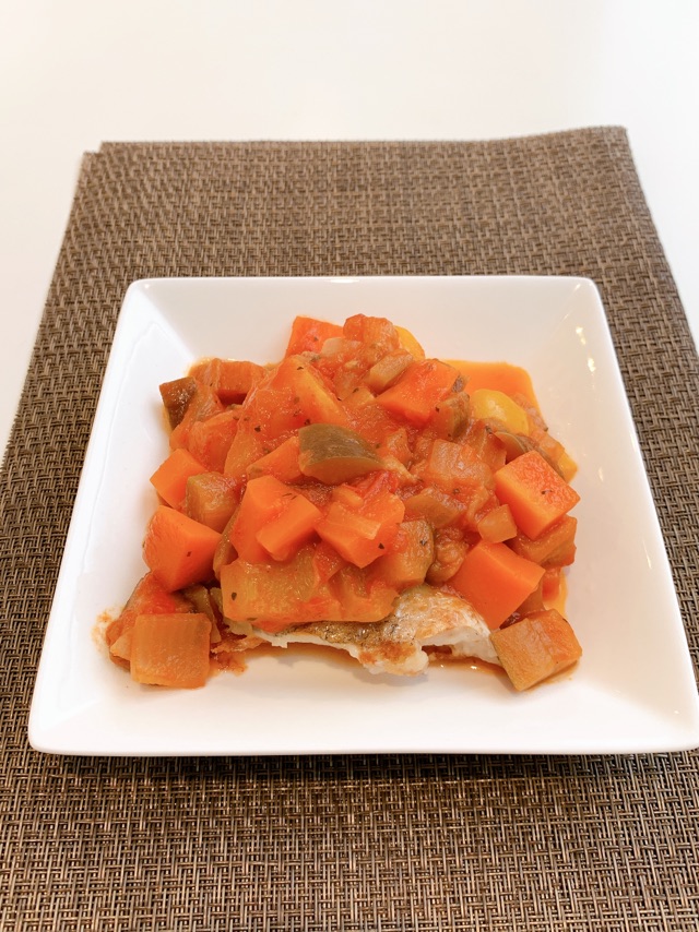⑤器に盛り、上から②のラタトゥイユソースをかけて完成。