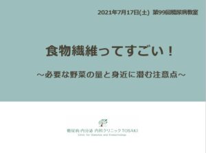 第99回糖尿病教室を開催しました 教室レポート 2021.07.232026.04.08 2021年7月17日(土)に、Web配信(Zoom)にて糖尿病教室を開催しました。 今回のテーマは、「食物繊維」についてでした。 食物繊維を摂るメリットとして、 便通改善・血糖値の急上昇を抑える・コレステロールの排泄を助ける効果があります。 1日20gを目安に摂ることを目指しましょう。 また、医師からは「治療薬について」、 検査技師から「合併症(眼・神経)について」をお話しました。 当日は多くの方にご参加いただきました。 次回は8月21日(土)に開催予定です。 是非ご参加下さい!