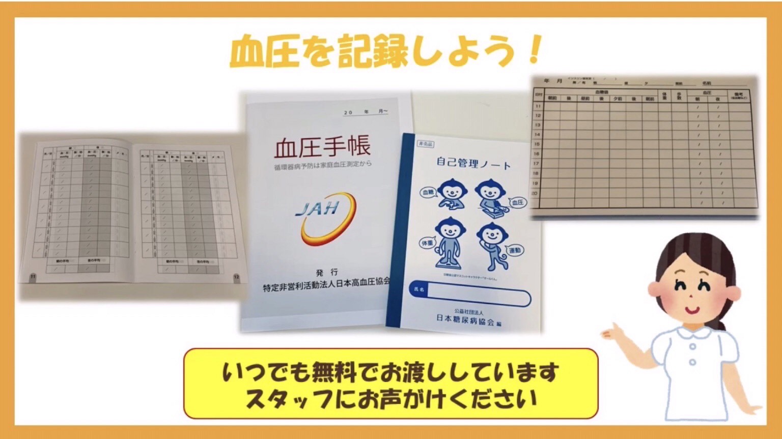 クリニックでは血圧手帳、自己管理ノートを無料でお渡ししています。