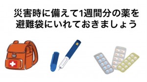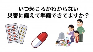 災害時に備えた準備について その他 2022.10.032026.04.08 みなさん、災害時に備えた準備はできていますか? 災害が起き、病院や薬局などが被災してしまうと薬の備蓄が少なくなってしまうことがあります。 東日本大震災の時は日本中で薬が足りなくなり、海外から緊急で輸入した薬もあります。 いつ起こるかわからない災害に備えて、1~2週間分の薬を避難袋にいれておくと安心です。 また、自分が飲んでいる薬の種類がわかるようにお薬手帳のコピーを避難袋に入れたり、携帯で写真を撮っておくことをおすすめします。