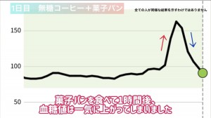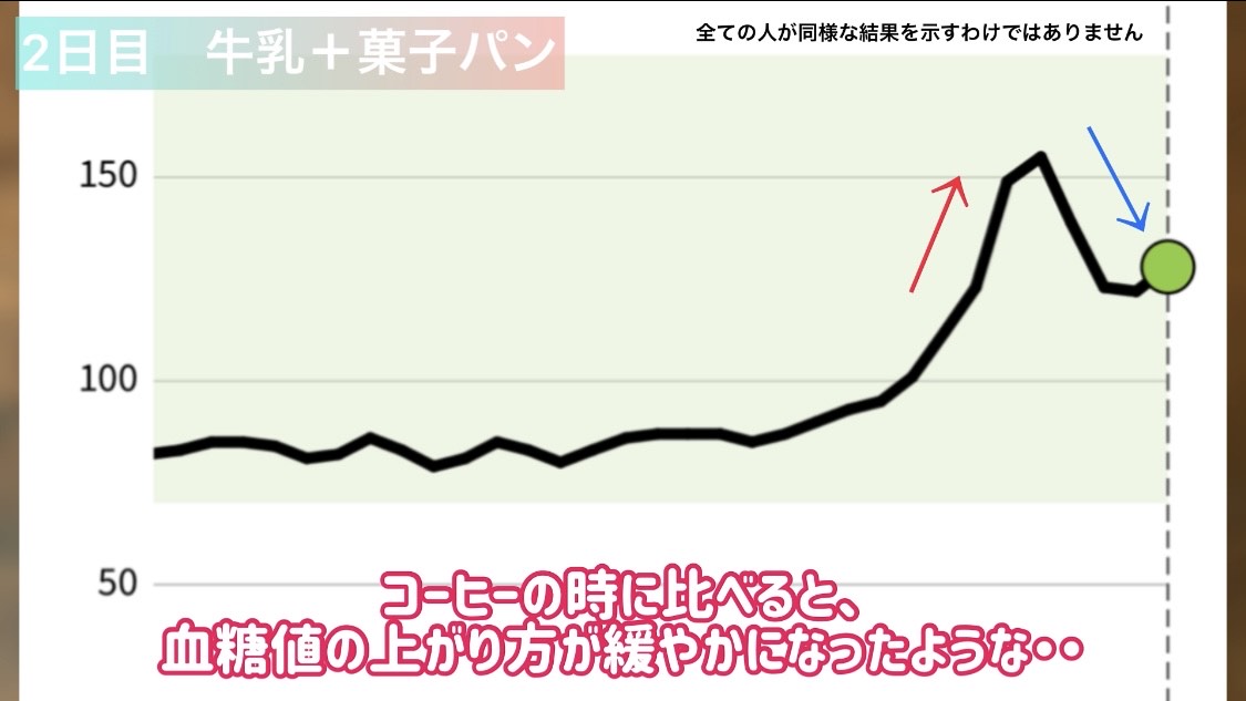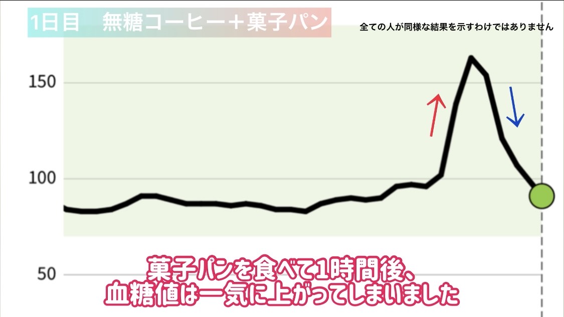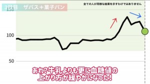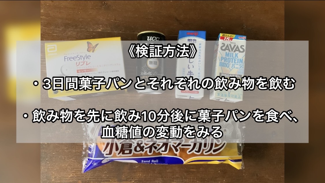 方法は、菓子パンを食べる10分前に①無糖コーヒー、②牛乳、③ザバス(高たんぱく質飲料)をそれぞれ飲み、その後の血糖値の変動を見てみました。