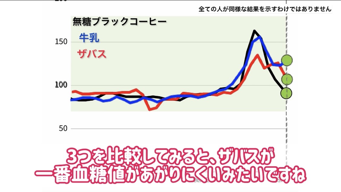 ザバスを飲んだ時が一番血糖値が上がりにくいという結果になりました。