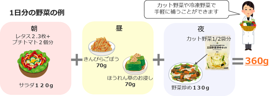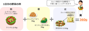 しかし、日本人の摂取量の平均値は256gと目標量より100g程度足りていない状況です。