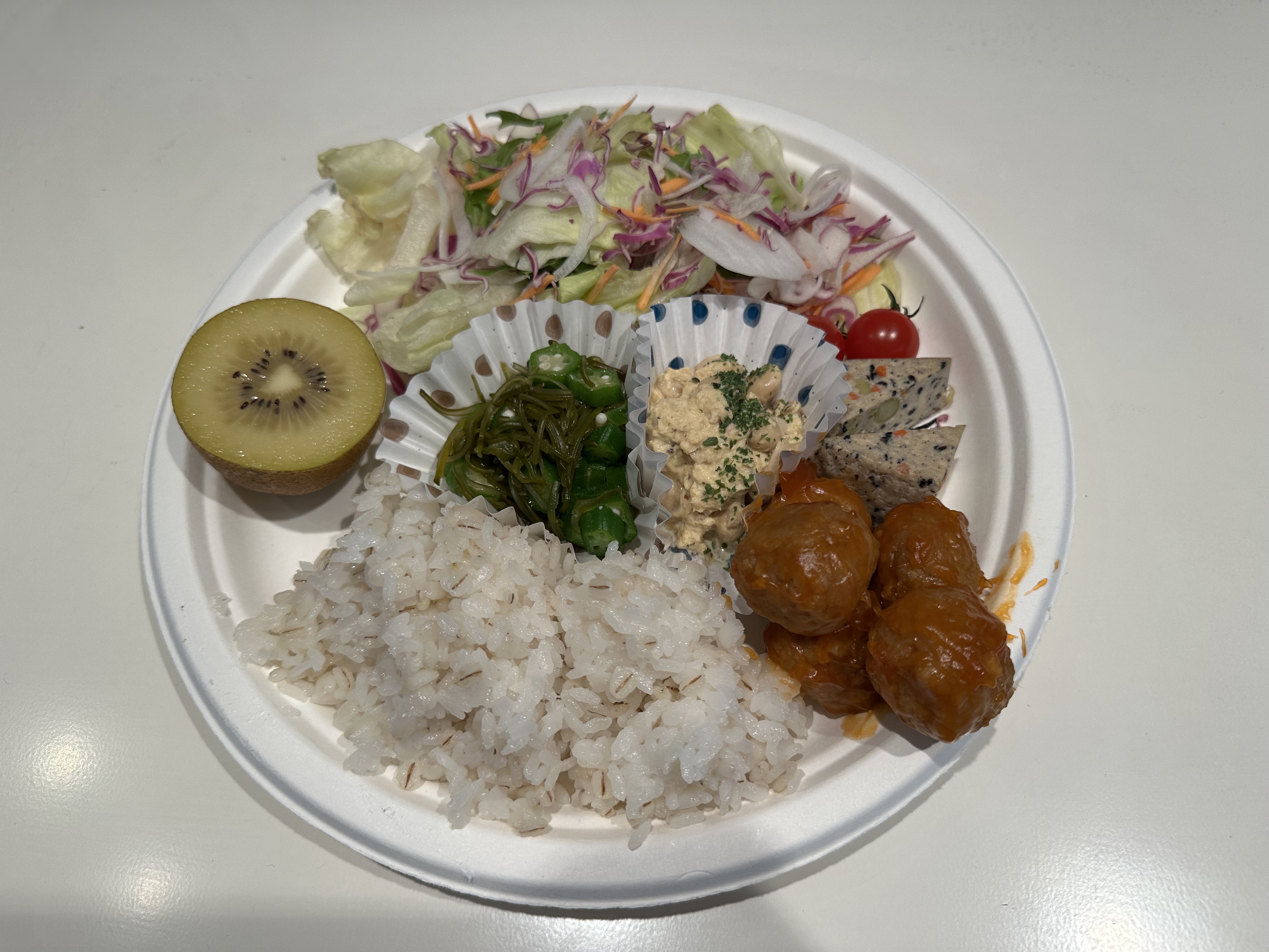 麦ごはん、肉団子の甘酢あんかけ、枝豆とひじきの豆腐バー、ツナと蒸し大豆のカレー風味、ミックスサラダ(ジャネフドレッシング)、オクラとめかぶのネバネバサラダ、ゴールデンキウイをワンプレートに盛り付けしました!