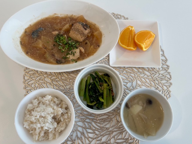 今回のメイン料理の「さば缶と大根のとろとろ煮」は食塩不使用のさば缶を使い塩分量を減らしました。